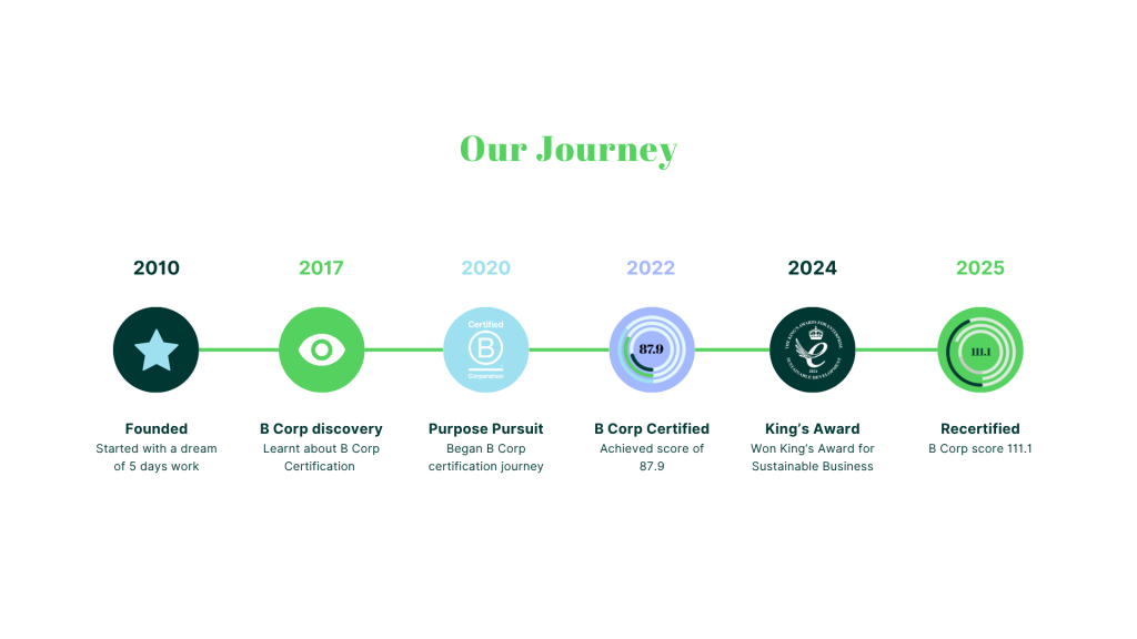 We became a B Corp in 2022 with an impact score of 87.9 out of 200 (UK average: 50.9). We recertified in 2025, and our score improved to 111.1, reflecting the team’s continued efforts. The impact assessment highlighted four key SDGs: gender equality, decent work and economic growth, reduced inequalities, and climate action. These goals remain at the heart of our work.