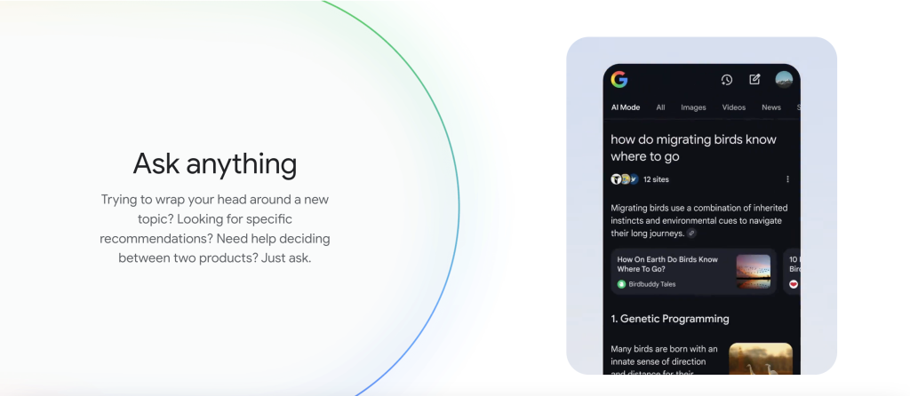 Google’s AI Mode is a new search experience powered by artificial intelligence, offering more conversational, context-aware answers to user queries. Unlike traditional search, where users manually find information by clicking through links, AI Mode provides more direct, relevant responses by exploring multiple related topics at once to address the user’s intent. This could mean everything from directly answering questions to summarising information across multiple sources.